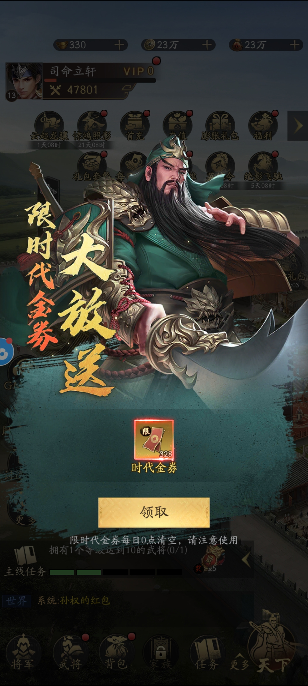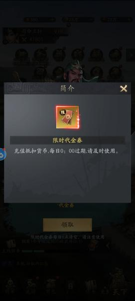 《三分天下 (每日送328代金券)》天天领328券猫发布于 2025-06-21免费版后缀说明-送每日328元代金券 【活动时间】:长期 【活动奖励】:328元代金券 【领取方式】: 1)在游戏主页-每日放 【活动规则】: 1、每日游戏内送328可拆分代金券,当日有效。