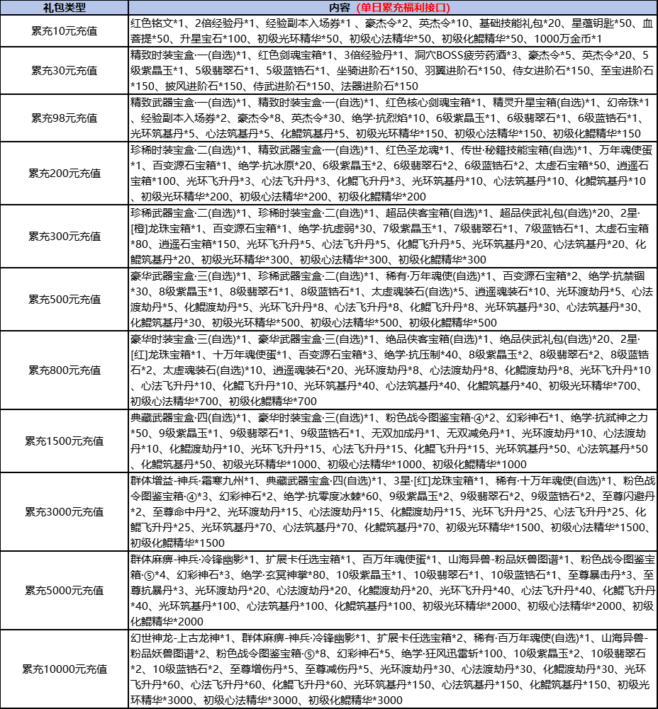 礼包3:限量外观宝箱*1、唤龙符*50、光环筑基丹*100、心法筑基丹*100、化鲲筑基丹*100礼包4:至尊坐骑丹*5、至尊羽翼丹*5、至尊侍女丹*5、至尊至宝丹*5、至尊披风丹*5、至尊侍武丹*5、至尊法器丹*5
