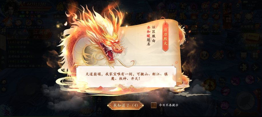 新服首日累计(实付)充值500元:龙行天下福泽八方*1(限定称号)、无双:齐天大圣碎片*100、8级紫晶玉*1、8级翡翠石*1、8级蓝锆石*1、