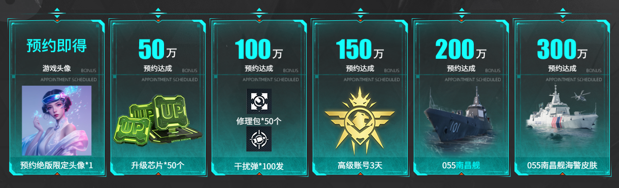 055南昌舰、055海警皮肤、预约限定头像等全渠道300万预约奖励提前发放。