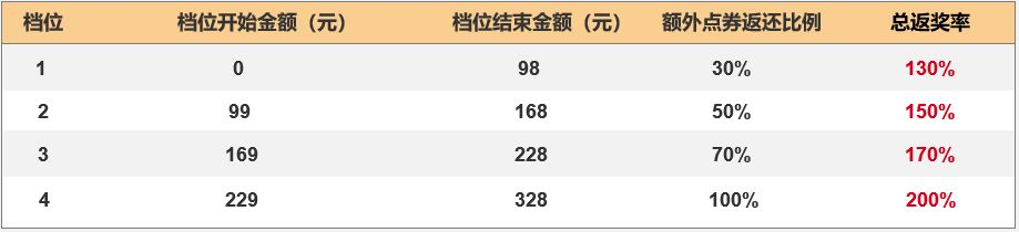 3)用户在「破晓测试」中,总共花费400元,除了充值获得的货币/直购礼包道具外还将额外获得98*30%*10+(168-99)*50%*10+(228-169)*70%*10+(328-229)*100%*10=2042点券。