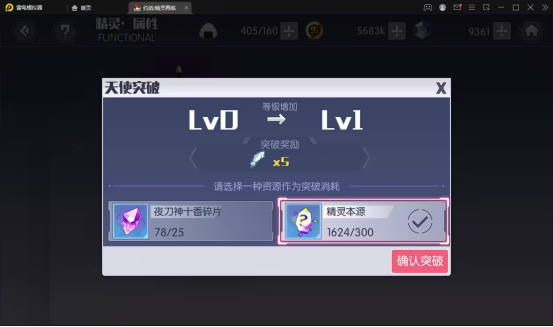 天使突破需要精灵EX品级并且达到60级以上才会开放,每次突破可以使用25同角色碎片或精灵本源400-500进行突破.具体消耗根据角色初始品级决定消耗本源数量,突破之后,我们会获得技能点数,