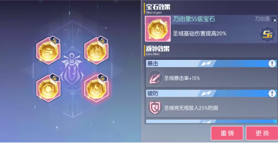 宝石除了自带的基础伤害提升,其次宝石达到S以及以上,会给予非常强力的效果,比如说15的暴击率穿透率,30的暴击伤害穿透伤害。SS的话更是有无视防御、减少冷却CD、吸血等额外效果。SSS级还会再次增加额外效果。