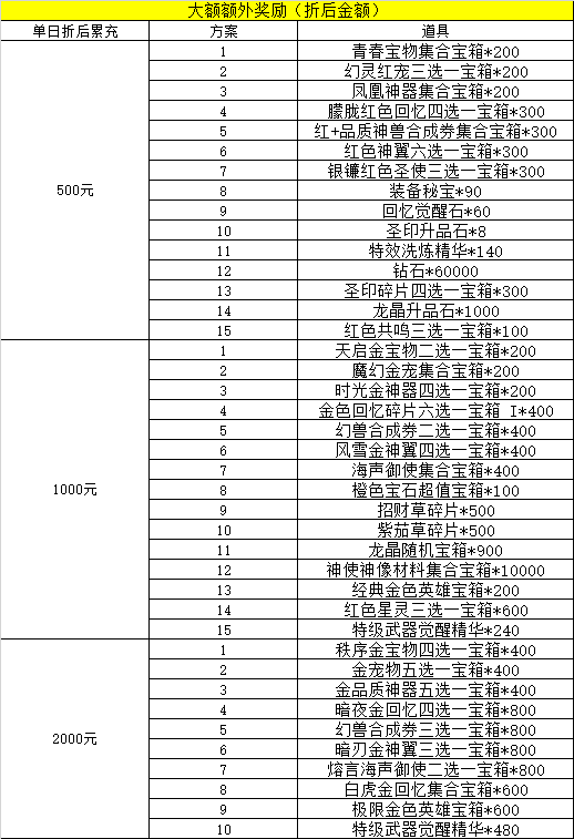 【活动内容】:该款游戏单日大额充值可申请额外奖励,具体福利请联系客服咨询。(单日最低充值金额:100000(实付500元)