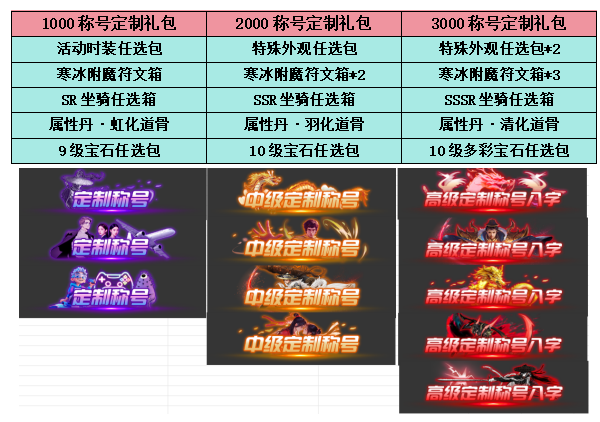 3、单日充值达到3000RMB可申请定制专属游戏称号(限定2-8字以内),由客服核对金额后发起申请