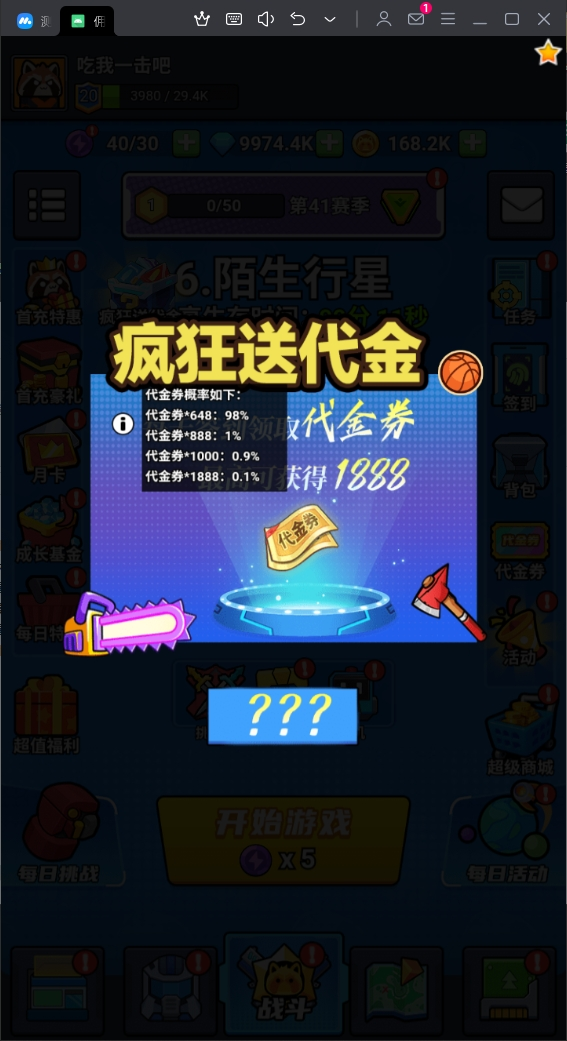4.玩家创角后,即可在主界面左上角看到"疯狂送代金"活动,再点击进入“疯狂送代金券”活动,点击即可抽取648~1888(折扣前)代金券,可直接在游戏内充值时抵扣
