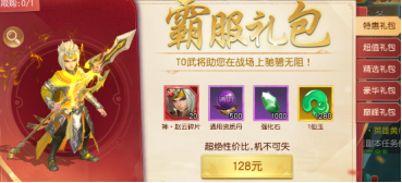 3、霸服礼包,如果觉得神将降临投入比较大可以购买霸服礼包入手神·赵云,神·赵云在前期也是很强势的输出位之一。且礼包比较划算,性价比超高,阵容搭配上也很百搭。