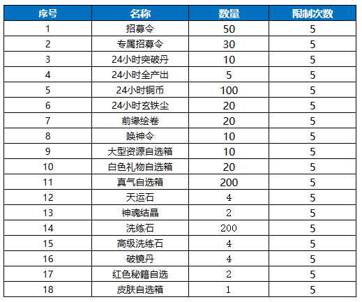 单日折后累计充值10000元及以上可额外申请:顶级元系侠客自选箱Ⅱ*50、大型资源自选箱*50、唤神令*200、破镜丹*100、神兵陨铁*10、天命星石*20、、称号自选箱*1