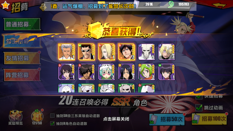 新手期阵容搭配推荐,我们先来讲个大前提,就是游戏中的卡牌初始情况下,稀有度越高越强力,所以不论大家招募到了哪位更高稀有度的SSR甚至SSR+,不要犹豫直接派上阵去。每次抽到卡牌时,都会有简单的描述介绍这名角色的定位,仔细阅读每张卡牌的技能介绍,相信以各位死神的聪明才智,肯定能慢慢摸索出一套成熟的搭配的~