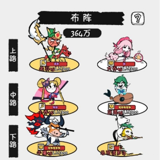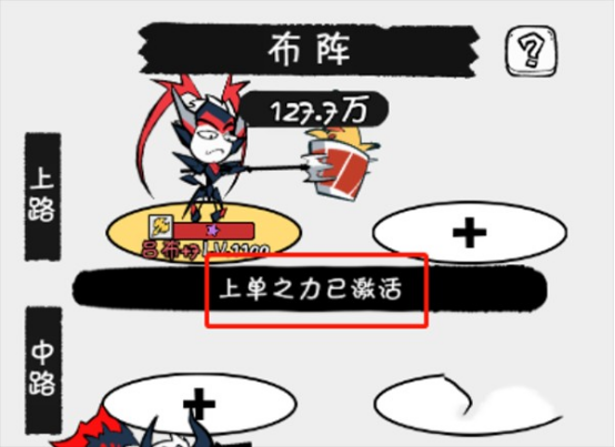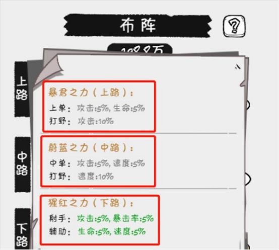 然后就是布阵,要根据自己的培养主C的特点去站位,上路一般是给到上单和打野位角色的,可以给上单角色提供5%的攻击和血量加成,打野提供10%攻击加成;中路给中单提供5%攻击和速度加成,给大家提供10%速度加成,下路是符合与射手路,给射手提供5%攻击和5%暴率加成,辅助提供5%生命和5%速度。以马可波罗为例,作为射手,自然是摆放在下路,而牛魔也是一样。如果培养的是吕布作为主C,自然是将他放在上路。
