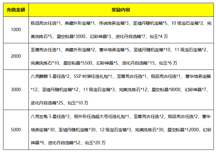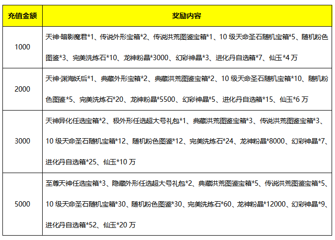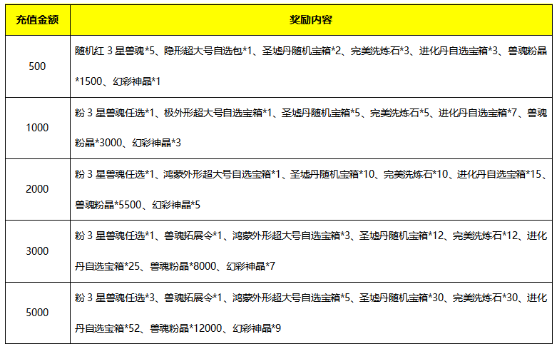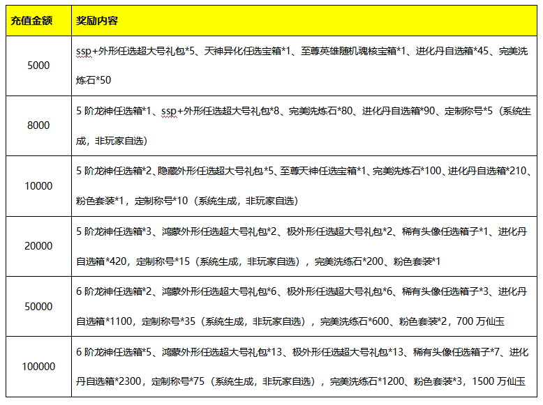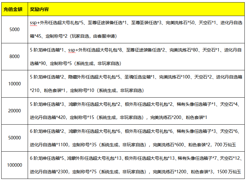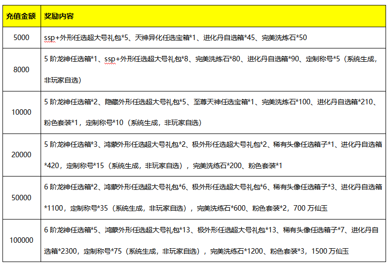 1、当天充值金额达到以下金额即可领取对应奖励(注,每个角色当天仅可领取最高档位的充累充返利,如充值20000,仅可领取最高20000元档位的奖励,5000-10000元不能领取)