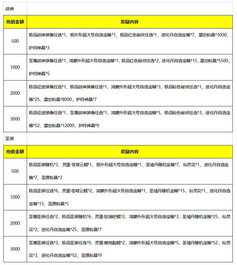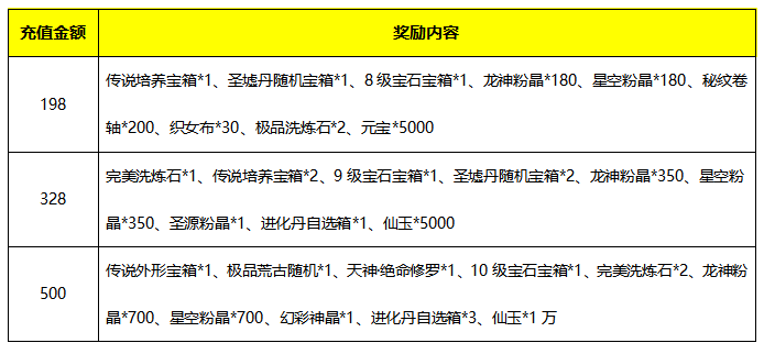 2、玩家每天充值达到指定额度可重复领取对应奖励