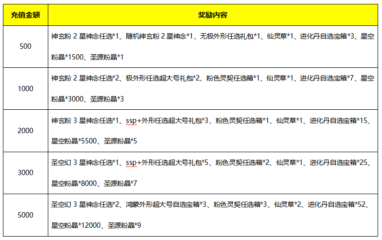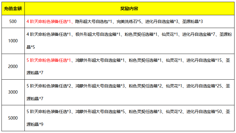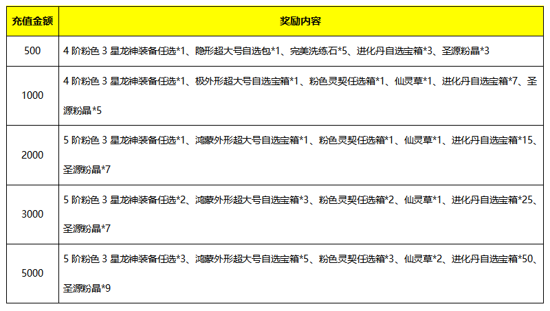 1、单日充值活动,可领取对应档位奖励,高档位可覆盖低档位的奖励,如玩家充值5000元,可领取500/1000/2000/3000/5000元档位充值