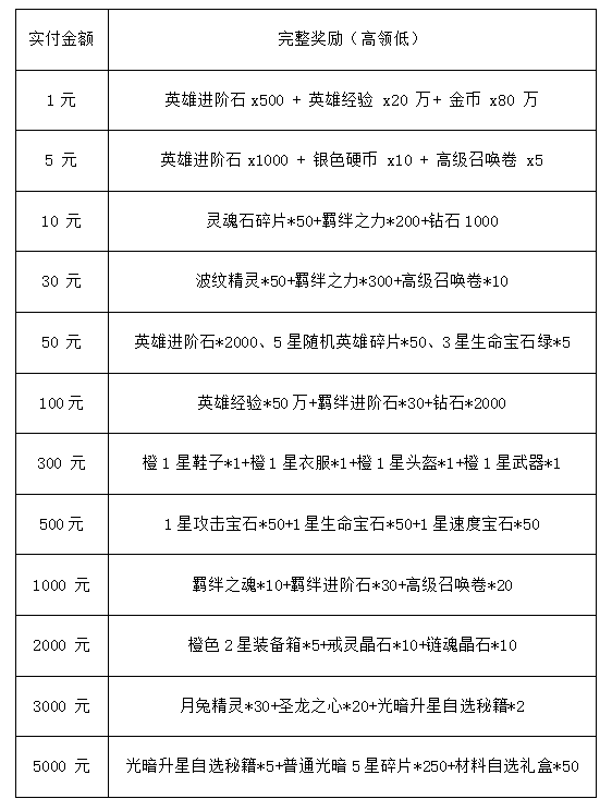 冠名礼包内容:高级召唤卷50 随机紫色3星装备*5 进阶石*500(第一个先充值达标的玩家才能领取)