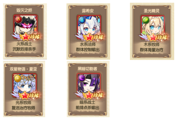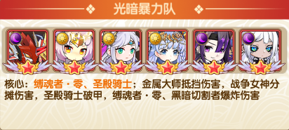 《大战英雄 (0.1折免费领648)》攻略白纸扇发布于 12-03阵容攻略 前期阵容推荐:小三强代表“毁灭之烬,章鱼公主,森镜之灵”,先走自然三系元素阵容,其余英雄按需求搭配; 小氪终极阵容:毁灭之烬,露希安,圣光精灵,双星物语·夏亚,黑暗切割者。 五系元素阵容 土豪终极阵容:光暗暴力队