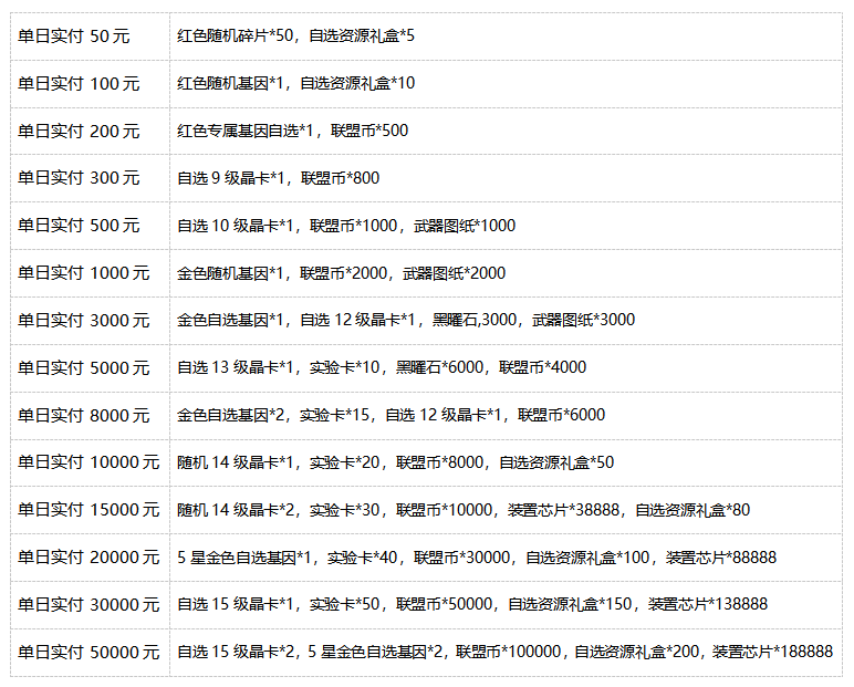 1、活动规则:活动期间单日充值满足条件即可领取对应档位其中一个方案(例如单日实付5000元可选择领取5000档位的方案之一)