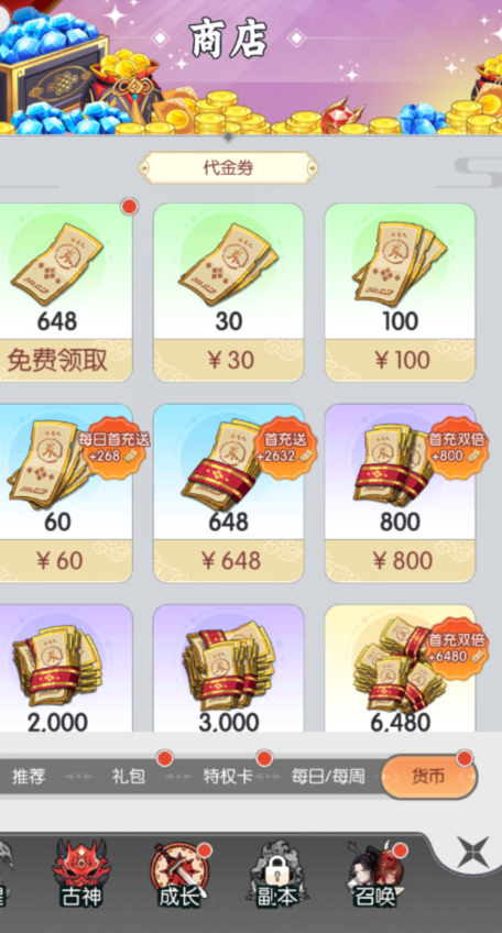 《九州幻境城 (1折免费版)》天天领648券猫发布于 12-05免费版后缀说明-送每日648元代金券 【活动时间】:长期 【活动奖励】:648元代金券 【领取方式】:每日在游戏内商店-货币领取648游戏内代金券 【活动规则】: 1、游戏内代金券可用于购买除开代金券礼包的其他商品,1代金券=1RMB 2、不重置,可叠加可拆分
