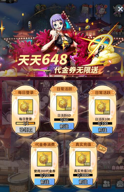 《进击的正太 (0.1折新世界启航)》天天送648券猫发布于 12-08【活动时间】:长期 【活动奖励】:648元代金券 【领取方式】:1)在游戏内,【主城】-【天天648】 【活动规则】: 1、完成活动需求即可获取代金券,最高可获取1296代金券,活动每日重置。 2、代金券不限时,活动为每个账号每天只能领取一次。 3、代金券玩家可拆开多笔使用,直至余额全部抵扣完。