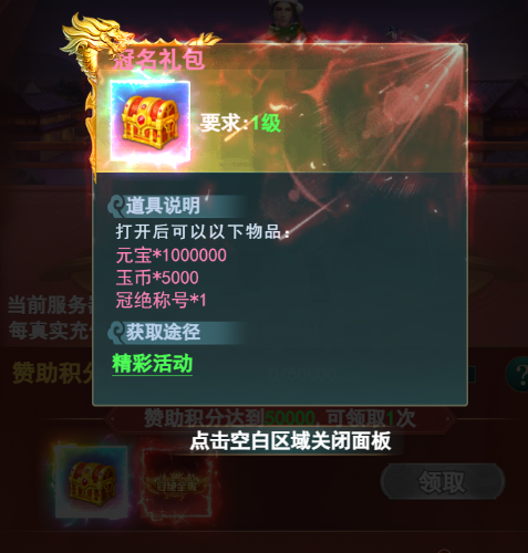 1、冠名者额外赠送神秘大礼包!同时被冠名区服会发送全区邮件公告天下!