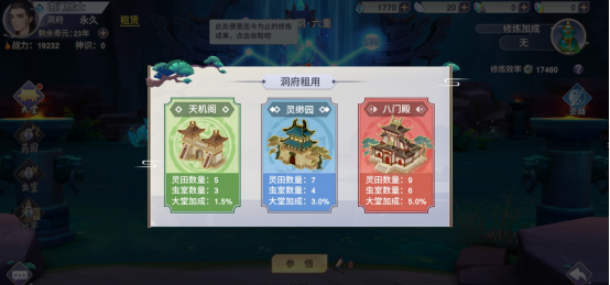 2.租赁高等级洞府,天机阁、八门殿等,都是一个长期投资,效益拉满。
