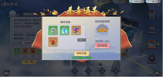 3.禁地采撷部分用于重置挑战次数或是结算奖励翻倍。