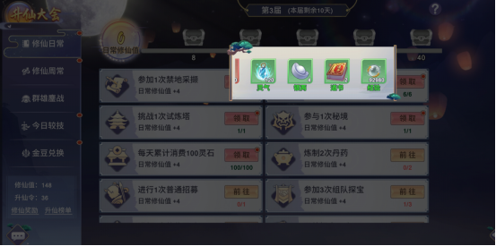 最后切记,就是各位道友记得修仙日常里面的任务都做完,因为这样基本上所有游戏系统和玩法也都做完,这里同样也能有不小的修为经验产出哦!