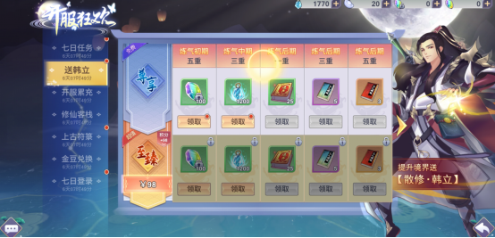 2.开服狂欢“送韩立”活动,提升道友修为,累计可免费获得至少上千灵石,有条件的开通至臻礼包,可多得双倍灵石奖励。