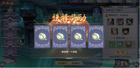 3.前期试练塔普通模式每天玩家尽力挑战到最高层,后期挑战因难度变大,挑战次数随之减少,遇到翻牌宝箱,一定要花费灵石全部领取(性价比最高),白嫖玩家开始挑战前记得存一些灵石。困难模式在通关普通模式120层后开启,奖励更好,对二队的战力有一定要求,量力而行;