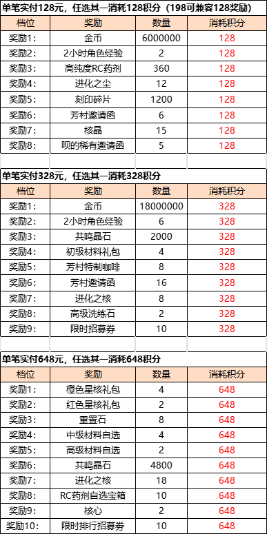 2.冠名礼包:内含稀有道具,终身仅可领取一次。(RC药剂自选宝箱*66,高级洗练石*3,进化之核*2,血欲晶石-低*1)