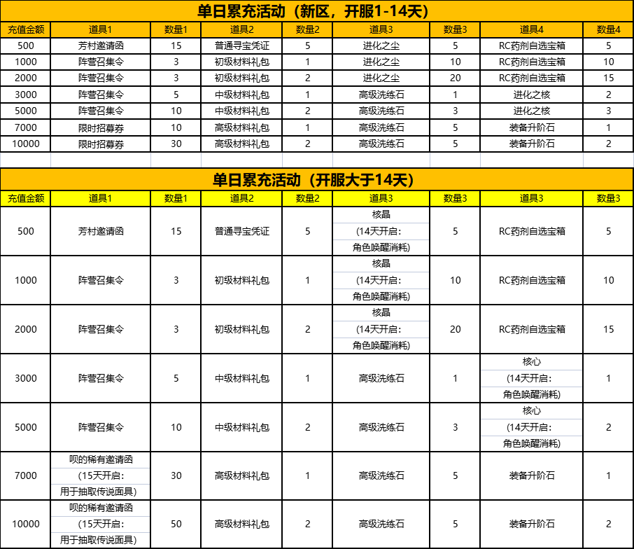 1、活动每日0点重置,仅当日累计。以活动开启当天计算,开服1-14天区服一种奖励;开服15天以上区服一种奖励,详见奖励表
