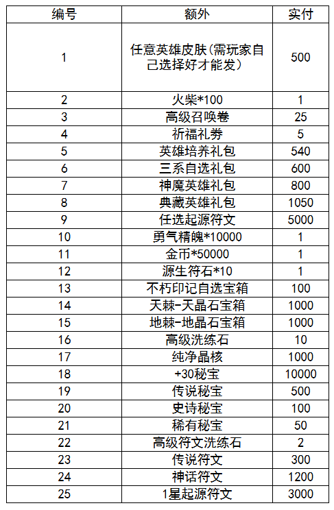 每充值对应实付即可选择对应的商品一次。例:单日实付充值1000,即可选择编号①一次+(火柴*100)*500