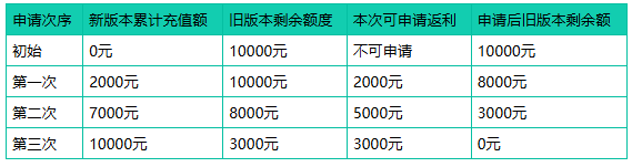 解读:该玩家分三次领取了全部10,000(实付)元返利。每次领取的金额,均由 (新版本当前总充值 - 已领返利)与旧版本剩余额度共同决定。