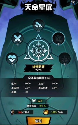 玩家可以通过消耗星辰精华来修炼层数,每修炼一次可提升全体英雄的属性加成。当修炼完五个属性后会增加一层通用天命层数。当玩家修炼至20层时,会开启职业:天命