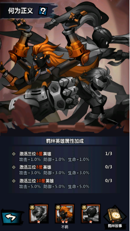 英雄图鉴:每次获得新英雄时即可点亮英雄图鉴,每次点亮均可获得全体英雄属性(可累计)。当同个阵营的英雄收集完毕后可以点亮左上角的宝箱获得额外的奖励哦!