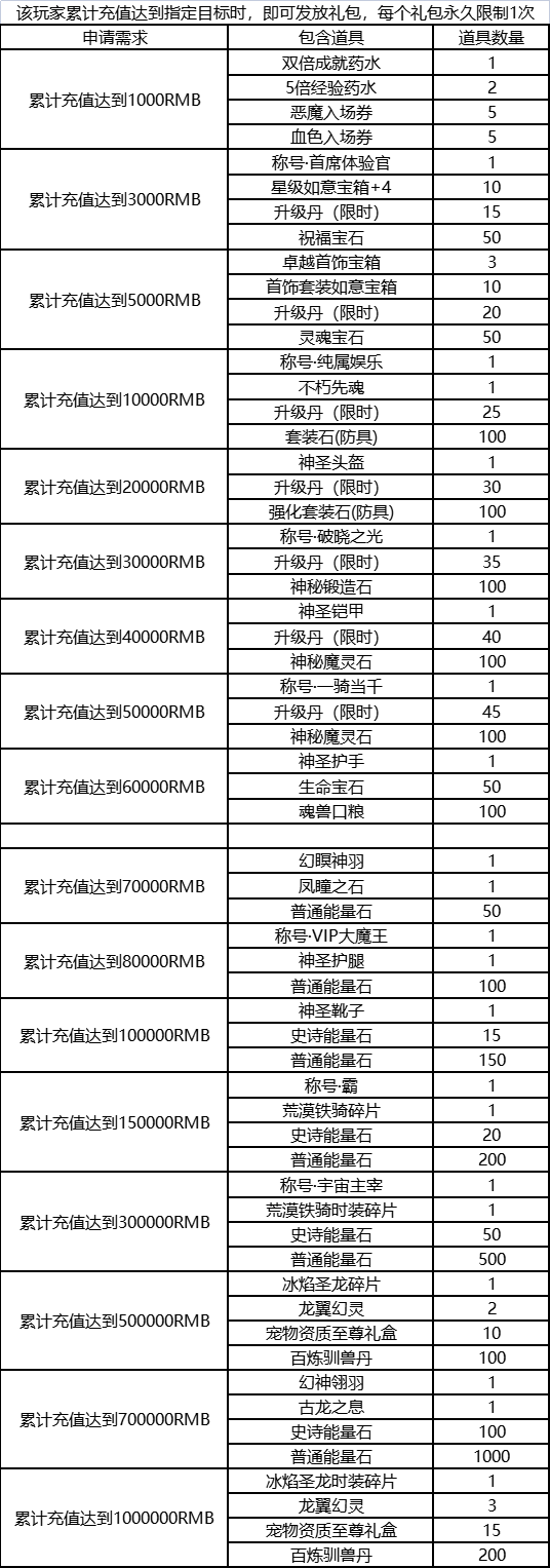 1、活动为单日累计充值,仅计算单日内玩家累计充值总额,次日重新计算(不能叠加,一般按最高档领)