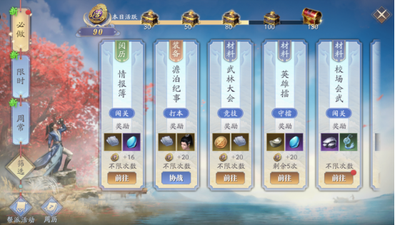 2、活动每日必做儋泊纪事、刺探、金殿对策、问剑、情报簿、海捕令等(根据等级逐渐开放新的必做任务)