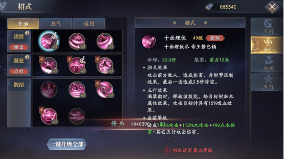 2、通用和轻功技能:翻滚、解控等。可在战斗中进行技能的躲避等操作。轻功可用于跑路或者连招。技能之间有连招,比如A技能可把敌人打浮空,可再接浮空技等。具体连招待玩家自我研究。