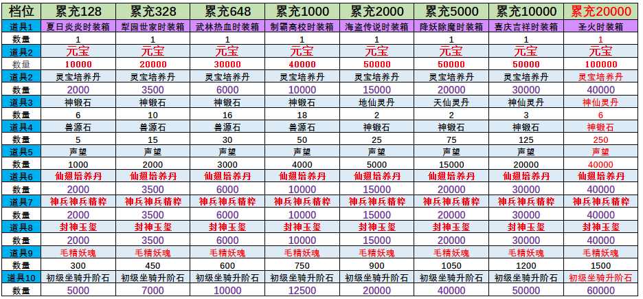 1、凡单笔充值金额达到以下档位的玩家可获得对应的礼包,重复充值可充值领取。