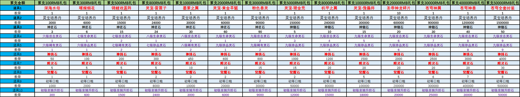 1、凡历史累计充值金额达到以下档位的玩家可获得对应的礼包,礼包可向下兼容,每种礼包单角色限制领取一次
