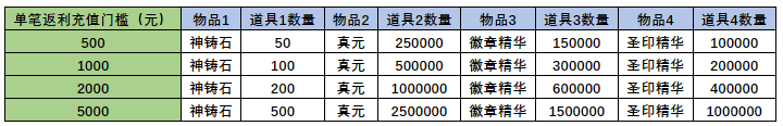 发放规则:凡单笔充值金额达到以下档位的玩家可获得对应的礼包,单角色限制领取一次