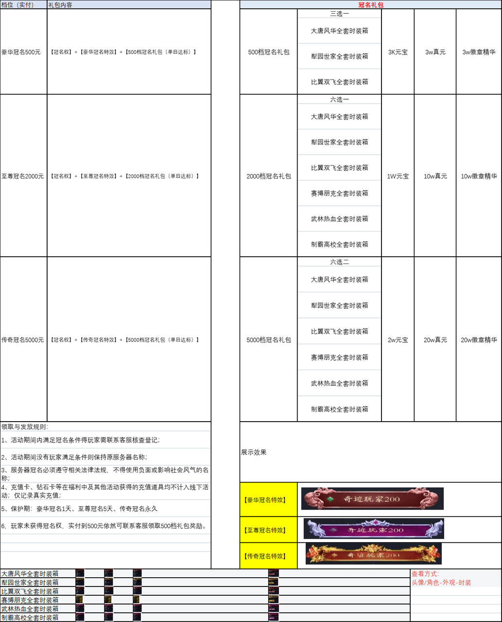 1、角色累充金额达到活动档位,且第一个联系客服的玩家可以获得所在区服的服务器【冠名权】+【冠名特效】*1;后续玩家只能申请更高档位的冠名。