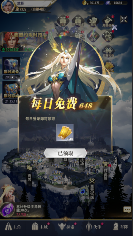 1、游戏内主城界面“免费648”每日登录领取1次648代金,代金券永久有效,次日重置领取次数
