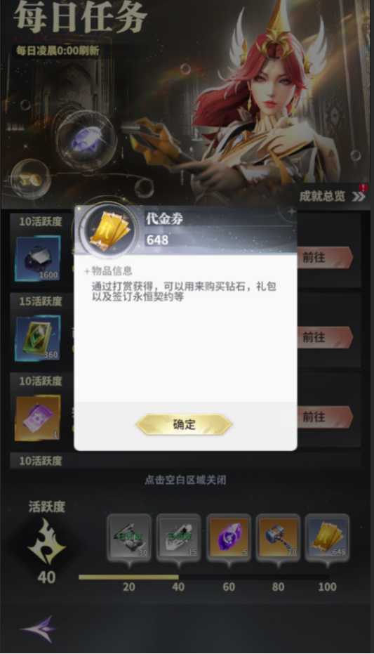 2、游戏内主城界面“每日任务”完成活跃度100可领取一次648代金,代金券永久有效,次日重置领取次数