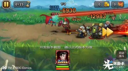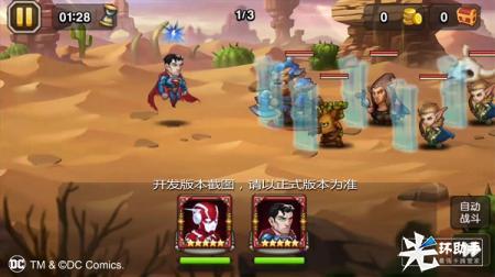 切同作战(普通):力量形态下的超人会举起一座废弃的大厦对敌方进行攻击,并造成眩晕;敏捷形态下的超人会快速飞至敌方最后排的一个敌人身后对其造成多段攻击,并将敌人打飞至战场边缘,造成眩晕。