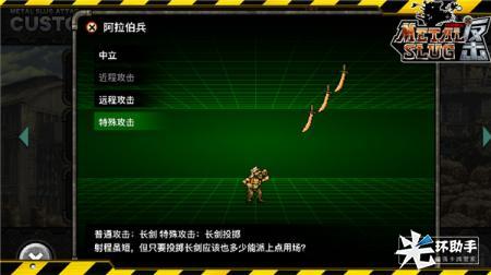 阿拉伯兵(也有人称他们为买买提刀兵):他们不仅仅是战士,还有着阿布斯羊肉串摊子店员的身份,爱好深吞宝刀是他们独有的特点。在“合金弹头2”和“合金弹头X”中都出现过,新作《合金弹头反击》将会再次延续这一兵种。他们会挥舞和丢掷弯刀来攻击敌人,冲向主角并用手里的大砍刀攻击,速度极快。在“合金弹头2”的剧情中,经历过第二次世界大战,他们跟随曾秘密失踪了2年的莫丁卷土重来,对拯救世界的“游隼”部队造成了巨大的冲击。那么在新作《合金弹头反击》中还将发挥怎样的作用呢?期待你的探索!
