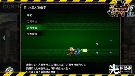 二代登场的火星人,虽然他拥有超低的血量和超慢的移动速度,但却拥有极快的攻击速度。特攻会瞬间移动到空中,射出一串泡泡,炮炮弹伤害很高,连续使用会在自军阵地展开一片泡泡弹幕,这样敌军撞过来不死也残。但是它却有点脆皮,操作不好的话,往往在特攻后或者刚刚走出家门,就被对方的远程特种兵干掉。在《合金弹头反击》中,据说只有不到10%的玩家才能将其运用到炉火纯青。但我相信,热衷于游戏的你们,一定会让我们大开眼界。