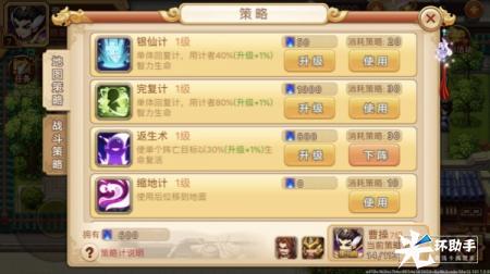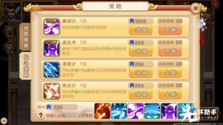 《乱世曹操传》策略系统大曝光youga发布于 2018-01-31 策略系统是《乱世曹操传》特有的系统,在武将技能外额外的一套新的技能系统。行军布阵怎么能少了计谋策略了。 在《乱世曹操传》中,策略系统分为地图策略和战斗策略。地图策略主要为增益辅助类。主要策略为银仙计,完复计,返生术,缩地计,飞渡计。战斗策略主要为伤害类。主要策略为炎热计、火龙术、炼狱之触、巨浪计、冰龙术、极寒领域、银仙计、完复计、洗髓术、离间计、返生术、清策计、免击计。