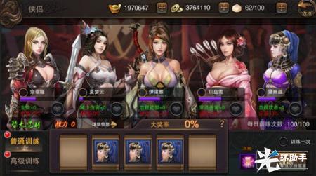 ②侠侣升级:需要消耗训练令,随机获得3~5个不同美人的经验道具。点击某个美女的小红心会提升获得该美女的几率(提高10%概率),但是要消耗更多的训练令,建议不是必要的情况下不要使用该功能,因为训练令只能从在线礼包和日常任务里获得,数量稀少。美女每升一级加700战力。