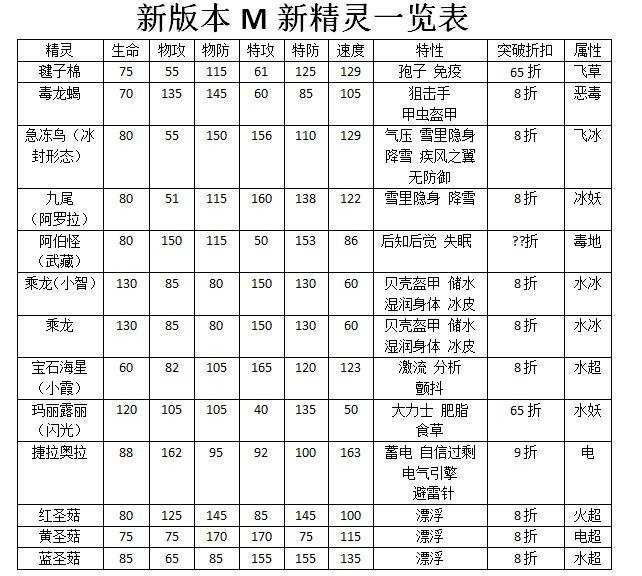 新版本要出的m精灵,汇总资料如上图,总体来说这次更新的精灵突破折扣都不大,只有毽子棉和玛丽是65折的,其它都是八九折左右。