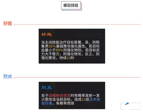 鲁肃的被动技能“好施”对于吴、蜀国来说是很友好的哦,而且有少许复杂~当主动技能治疗目标是吴、蜀时,会按照鲁肃的26%基础策攻强化属性。若目标血量小于80%强化物防,若目标武力>智力,强化物攻,若目标武力=智力,强化物攻,若目标武力<智力,则强化策攻,持续时间都是10秒哦!同时,被动技能“合众”可以降低己方所有部队收到的物理技能伤害。除了强化属性和降低物理伤害以外,鲁肃还可以打!当处于远程射击状态时还有概率发射一发火箭攻击当前目标,造成12倍法术伤害,并有概率燃烧,辅助输出两不误!
